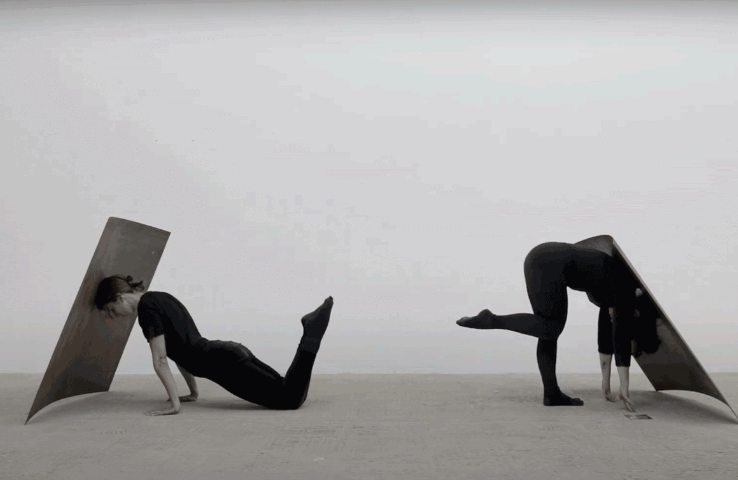 Elliptical Writing is both a linguistic and sculptural action that explores the origins of language in a situation of radical gravity. It features two steel plates connected by an elliptical area, with movement inscriptions carved into them, allowing two performers to read and engage with the piece.